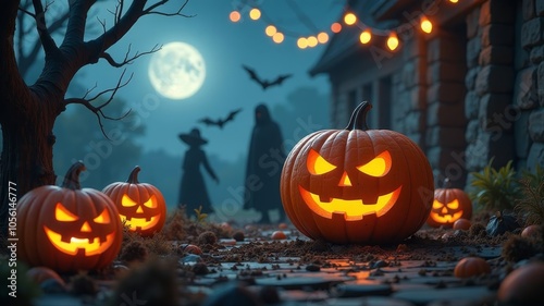 Fototapeta premium spooky halloween night with haunted houses, creepy decorations, costumes and pumpkins