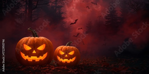 © Kristina, Fototapeta premium Spooky Halloween Night with Two Glowing Jack-o'-Lantern Pumpkins, Flying Bats and Red Mist in Dark Forest, Cinematic Lighting, Isolated