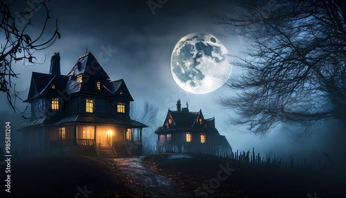 © SolaruS, Obraz premium Spooky Halloween Nighttime Scene with Haunted Atmosphere