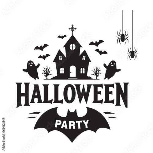 Obraz premium Spooky Halloween Party Design with Haunted House, Ghosts, Bats, and Spiders