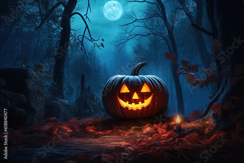 © DigitalMuse, Fototapeta premium Spooky Halloween Pumpkin Design Jack O Lantern - Generative Ai
