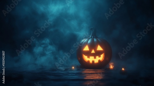 Naklejka premium Spooky Halloween pumpkin glowing in misty atmosphere