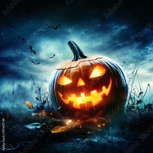 © Ahmad, Fototapeta premium Spooky Halloween Pumpkin in Dark Autumn Night background