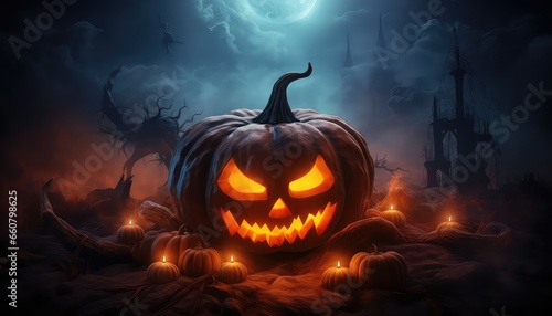 Fototapeta premium Spooky Halloween Pumpkin in Fire and Darkness