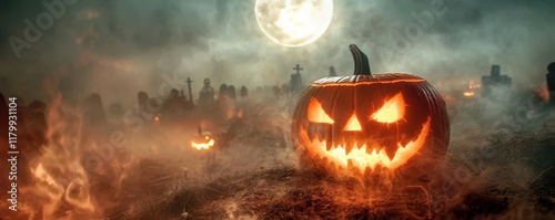 Naklejka premium Spooky Halloween Pumpkin in Foggy Graveyard at Night