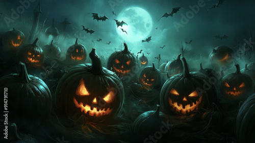 Fototapeta premium Spooky Halloween Pumpkin Patch Under Full Moon – Creepy Jack-O'-Lanterns in...
