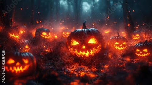 Fototapeta premium Spooky Halloween Pumpkin Patch with Glowing Jack-O'-Lanterns in a Dark Forest Setting, Perfect for Halloween-Themed Designs, Decorations, and Festive Celebrations
