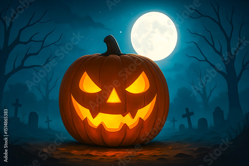 Fototapeta premium Spooky Halloween Pumpkin with Full Moon in Background