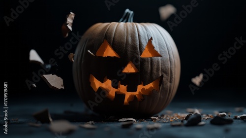 Fototapeta premium Spooky Halloween Pumpkin With Jagged Face Surrounded by Flying Pumpkin Fragments and Darkness