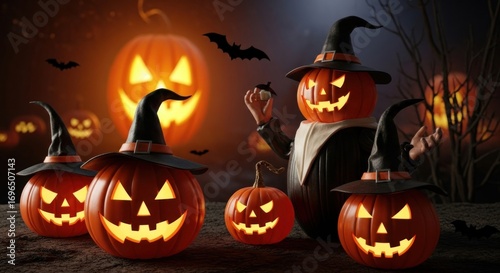 Fototapeta premium Spooky halloween pumpkins glowing in the dark with bats and witch hats