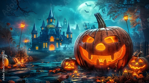 Naklejka premium Spooky Halloween pumpkins in front of haunted castle. Scary Halloween scene...