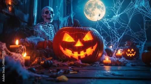 Naklejka premium Spooky Halloween scene featuring carved pumpkins, a skeleton, candles, and...