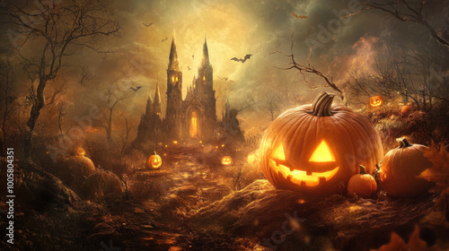 © AlexPhototest, Naklejka premium spooky Halloween scene featuring haunted castle surrounded by eerie trees and glowing jack o lanterns. atmosphere is filled with bats and haunting moonlight, creating thrilling ambiance