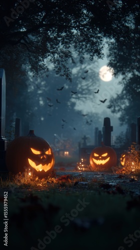 Fototapeta premium Spooky Halloween scene with carved pumpkins.