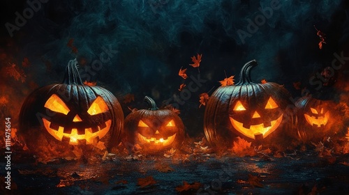Naklejka premium Spooky Halloween Scene with Glowing Jack O Lanterns and Autumn Leaves at Night