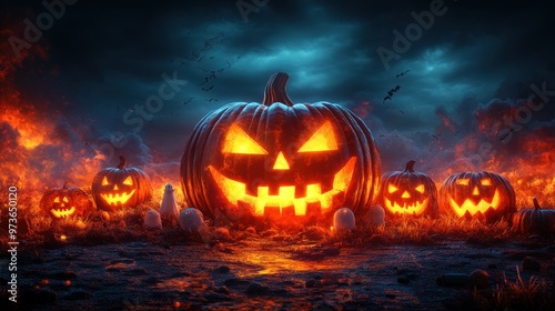 Fototapeta premium Spooky Halloween scene with glowing jack-o'-lanterns and fog.