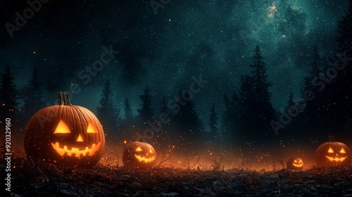 © Pual GotoMars, Naklejka premium Spooky Halloween scene with glowing jack-o'-lanterns in a dark forest under a starry night sky.