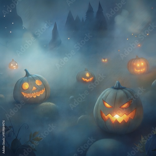 © Violetta, Fototapeta premium Spooky Halloween scene with illuminated carved pumpkins in eerie misty atmosphere