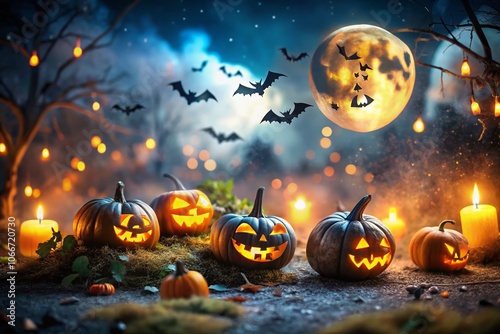 © Supittra, Naklejka premium Spooky Halloween Scene with Jack-O-Lanterns, Bats, and Eerie Night Sky - Tilt-Shift Photography Style for a Whimsical and Creepy Atmosphere
