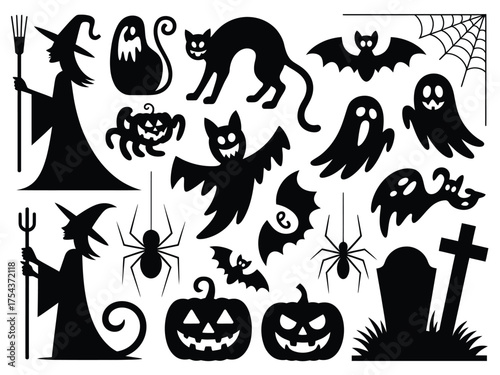 Fototapeta premium Spooky halloween silhouette vector graphics collection witch cat ghost pumpkin bat spider icon eps scalable silhouette vector illustration white background