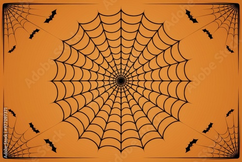 Fototapeta premium Spooky Halloween Spider Web and Bats on Vibrant Orange Background - Perfect for Party Decorations and Graphic Design
