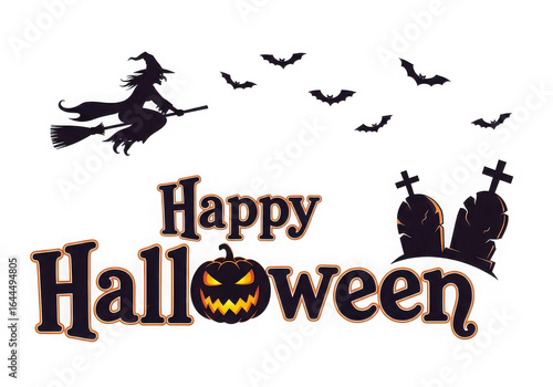Fototapeta premium Spooky happy halloween text with witch and bats