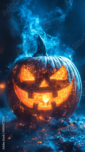 Naklejka premium Spooky Jack-o'-lantern glowing with eerie blue smoke.