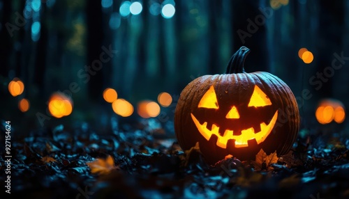 © narak0rn, Naklejka premium Spooky Jack-o'-lantern in a dark forest with glowing eyes.