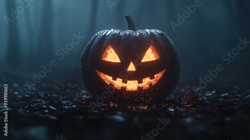 Naklejka premium Spooky Jack o Lantern In A Foggy Forest At Night