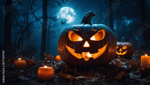 Fototapeta premium Spooky jack-o-lantern in dark forest illuminated by soft glow of moon