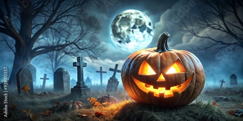 Fototapeta premium Spooky jack-o-lantern with a creepy smile in a moonlit cemetery graveyard
