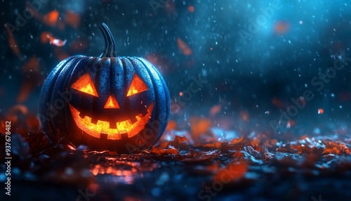 Fototapeta premium Spooky Jack-o'-Lantern with Dark Glowing Lights in Haunted Forest Setting