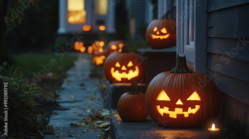 Fototapeta premium Spooky Jack-o'-Lanterns Lining the Stairway