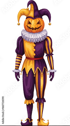 Fototapeta premium Spooky Jackolantern Jester Character with Purple and Gold Costume.