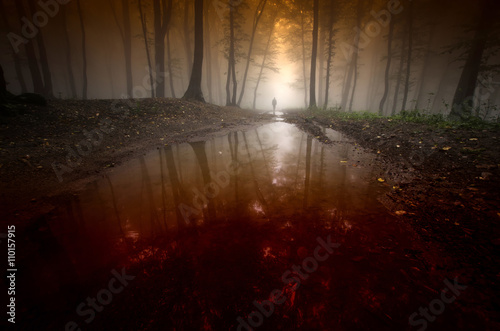 © andreiuc88, Fototapeta premium spooky man reflecting in water in surreal dark forest