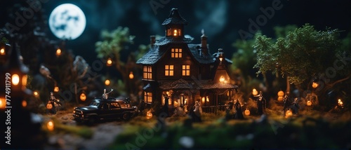 Obraz premium Spooky Miniatures: AI-Generated Halloween Images Perfect for Your Projects! From Tiny Haunted Houses to Miniature Pumpkins, These Images Bring Big Halloween Fun! Party in mansion at night, costumes.