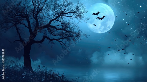 © AkuAku, Fototapeta premium spooky night background with moon tree and bat elements