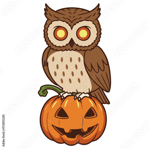 Obraz premium Spooky Owl with Glowing Eyes Perched on a Halloween Pumpkin