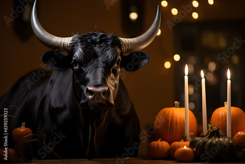Naklejka premium Spooky portrait of a bull in a Halloween setup in studio, dramatic lighting....