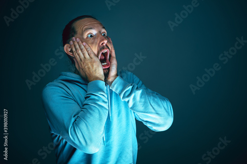 © master1305, Fototapeta premium Spooky. Portrait of young crazy scared and shocked caucasian man isolated on dark background. Copyspace for ad. Bright facial expression, human emotions concept. Watching horror on TV, cinema.