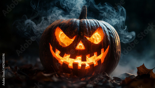 © Jeronimo Ramos, Naklejka premium Spooky pumpkin glowing in dark Halloween night flame generated by AI