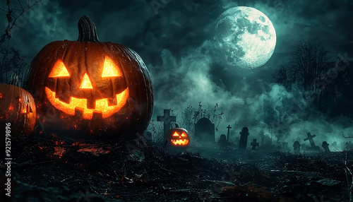 © Jeronimo Ramos, Naklejka premium Spooky pumpkin glowing in the dark night forest generated by AI