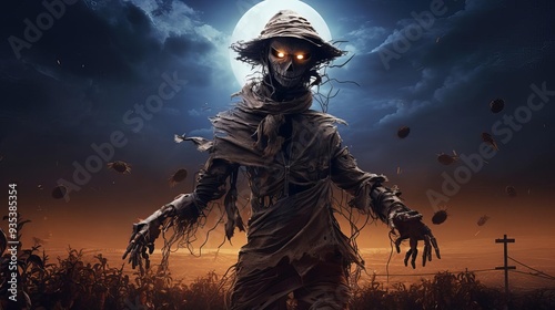 Fototapeta premium Spooky scarecrow, tattered clothes, glowing eyes, moonlit field, Watercolor...