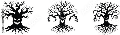 © Tamimkhangeox, Obraz premium Spooky silhouette of Halloween Tree| Scary Evil Tree Silhouette with Bats| Halloween Spooky Vector