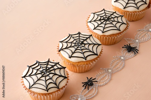 © Thanawat_Suesoypan, Naklejka premium Spooky spider web cupcakes for Halloween celebration