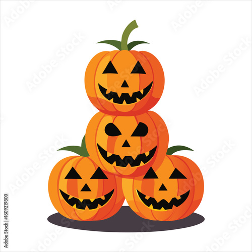 © Pixel Art, Fototapeta premium Spooky stack of four carved halloween pumpkins with glowing jackolantern faces, arranged in a pyramid formation on a white background