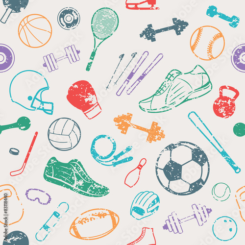 © Vlad Klok, Naklejka premium Sport Equipment Grunge Background, Seamles Pattern, Icons