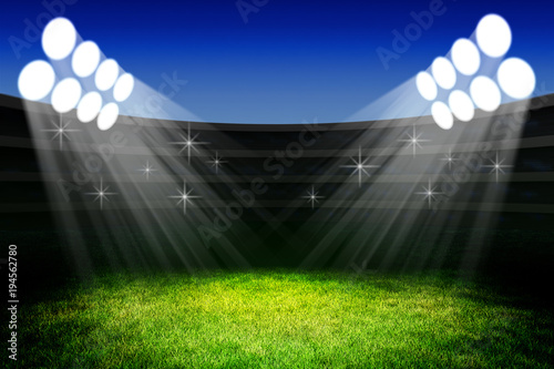 Obraz premium Sport event celebration ceremony concept, light of spotlights on the green grass field of the stadium arena