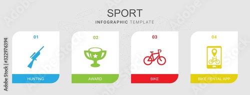 © Kirill, Naklejka premium 4 sport filled icons set isolated on infographic template. Icons set with Hunting, award, Bike, Bike rental app icons.
