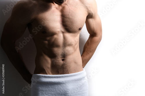 Fototapeta premium Sport guy with hair, male model with white towel in bathroom